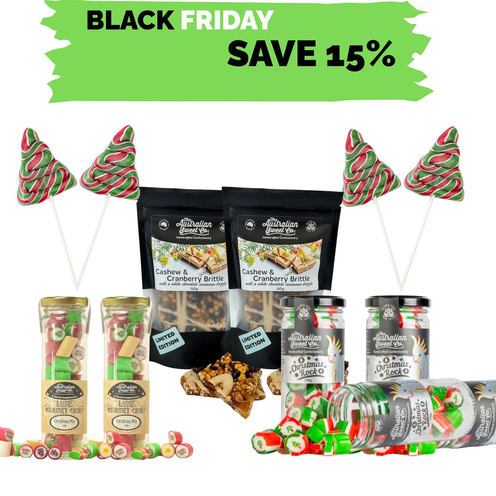Pick your festive faves — rock candy, premium mixes, tree lollipops, brittles — and build the ultimate Christmas treat bundle. Colourful, crunchy, nostalgic and ridiculously delicious.